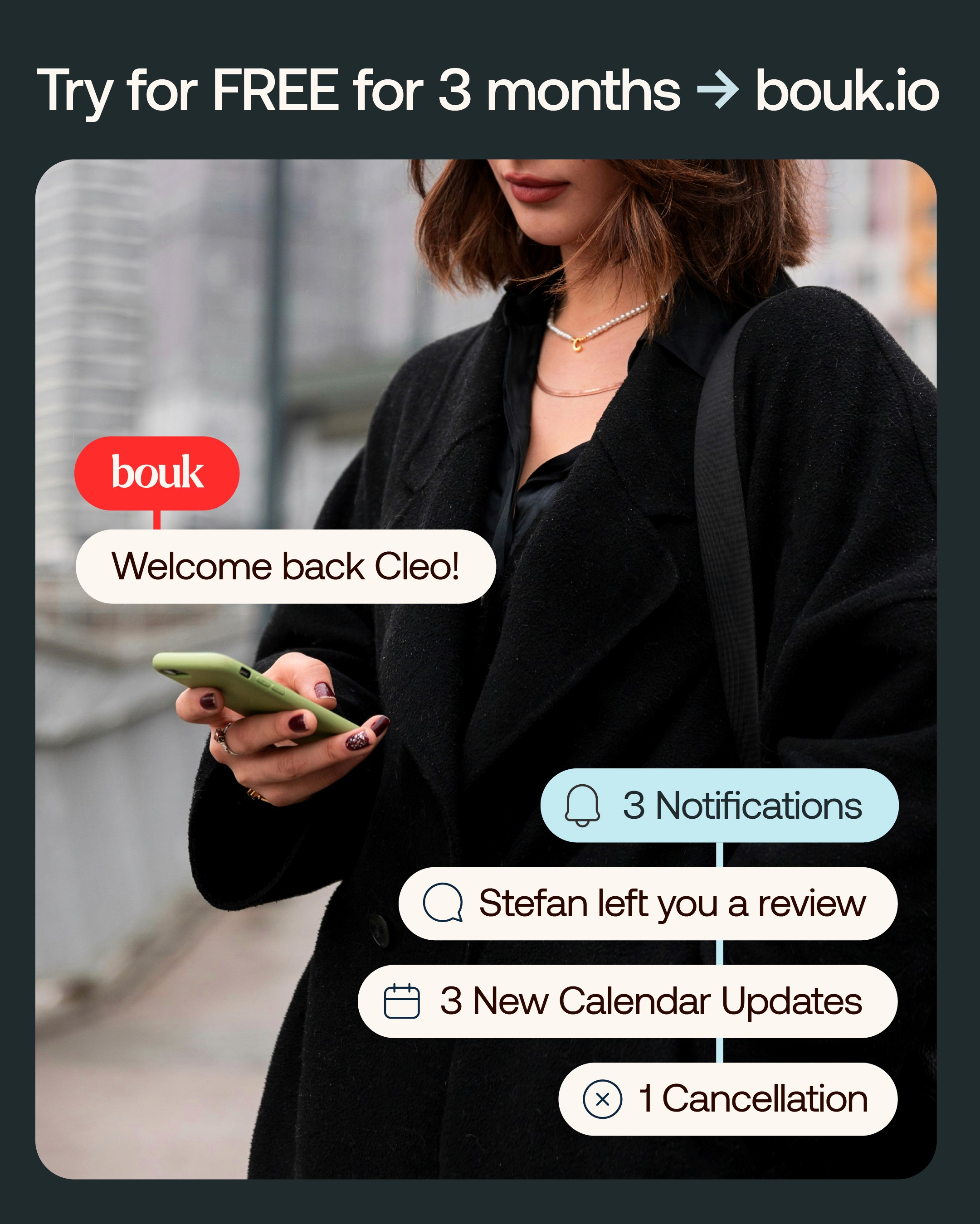 The stylised logo offers distinction, the UI system brings clarity and ease of use, and the photography and colour palette humanise the technology. Together, these elements communicate Bouk’s promise of effortless bookings and support its goal of helping businesses focus on delivering great experiences.